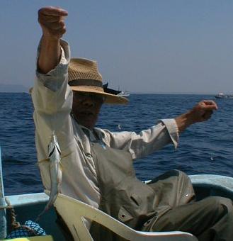 7月19日 水曜日 晴れ 場 所 沖ノ島(水深31m) マタカ 43cm〜56cm 12匹 え さ ウタセエビ 流し釣り |