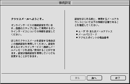 □「接続設定」の「クラリスメールへようこそ」のダイアログが表示されます。![]() 次へ」のボタンをクリックします。 |