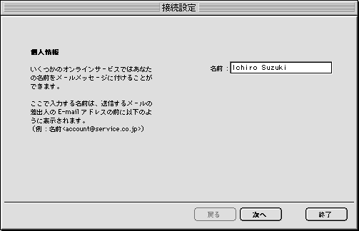 □「接続設定」の「個人情報」のダイアログが表示されます。![]() ・「名前:」 ローマ字で名前を入力 設定しましたら、「次へ」ボタンをクリックします。 |