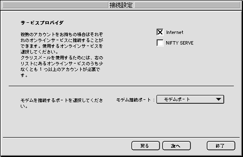 □「接続設定」の「サービスプロバイダ」のダイアログが表示されます。![]() ・「Internet」を選択 ・「モデム接続ポート:」 モデム等を接続しているポートを選択 |