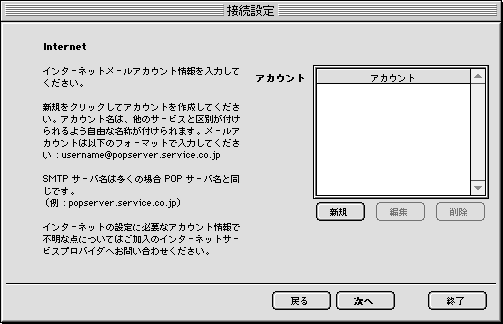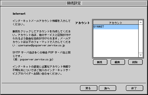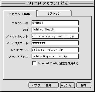 アカウント設定」のダイアログが表示されます。「アカウント情報」タブを選択します。![]() ・「アカウント名:」 [SYNNET] と入力(任意の名前でも構いません。) ・「名前:」 先ほど入力した設定となっています ・「メールアカウント:」[ユーザ名]@pop.synnet.or.jp 例)ichiro@pop.synnet.or.jp 注)利用開始日が、98年5月15日以降の会員の方は、 [ユーザ名]@pop.[サブドメイン].synnet.or.jpとなります。 例)ichiro@pop.na2.synnet.or.jp ・「メールパスワード:」[パスワード]を入力 ・「SMTPサーバ:」 smtp.synnet.or.jp 例)smtp.synnet.or.jp 注)利用開始日が、98年5月15日以降の会員の方は、 smtp.[サブドメイン].synnet.or.jpとなります。 例)smtp.na2.synnet.or.jp ・「メールアドレス:」 [ユーザ名]@synnet.or.jp 例)ichiro@synnet.or.jp 注)利用開始日が、98年5月15日以降の会員の方は、 [ユーザ名]@.[サブドメイン].synnet.or.jpとなります。 例)ichiro@na2.synnet.or.jp ・「Internet Config 設定を使用する:」 Internet Configをあらかじめ設定し利用している場合には、チェックします。 |