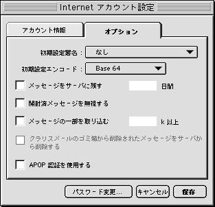 □"「オプション」タブをクリックします。![]() ・「初期設定エンコード:」 相手が受けられる方式に設定 ※最近では、MIME(Base64)方式が一般的になりつつあるので、「Base64」を選択します。 (フリーソフトウェアのEudora-Jへファイル添付する場合は、BinHexとします。) ・「メッセージをサーバに残す」 通常チェックしません 「保存」ボタンを押して、設定を保存します。 |