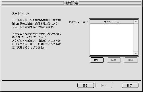 □"「接続設定」の「スケジュール」のダイアログが表示されます。![]() ここでは特に設定しません。 「終了」ボタンをクリックします。 |