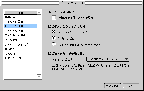 □「プレファレンス」ダイアログの「種類」から「メッセージ送信」を選択します。![]() 「メッセージ送信時:」 ・「初期設定で添付ファイルを圧縮」 チェックしません |