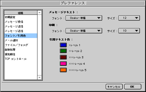 □「プレファレンス」ダイアログの「種類」から「フォント/引用色」を選択します。![]() ・「メッセージテキスト:」「フォント:」,「印刷:」「フォント:」 ほとんどのメールメッセージでは、等幅フォントが一般的なため、等幅フォントを推奨します。 例)Osaka-等幅, 等幅明朝 他の項目はお好みに応じて設定してください。 以上で、基本的な設定は終了です。「OK」ボタンをクリックし、メニューを閉じます。 |