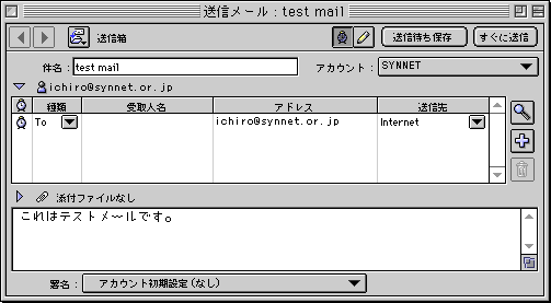 【補足事項】 ※送信先のアドレスは、「アドレス」欄に完全な電子メールアドレスを入力し、「送信先」欄は「Internet」が選択されていることを確認します。 「送信先」という機能は、「アドレス」欄に入力された文字列(ユーザ名)に「@」と送信先リストに設定されているインターネットドメイン名を補完し送信する機能です。 しかし、SYNNETのような@以降にサブドメインを必要とするプロバイダの場合、使い勝手が悪いことがあります。 「送信先」にデフォルト設定でSYNNETが登録されていますが、「ichiro@na2.synnet.or.jp」というアドレスに送る場合、このまま「アドレス」欄に[ichiro]を入力し「送信先」欄で 「SYNNET」を選んでも、アドレスに「@synnet.or.jp」が補完されてしまいます。つまり、送信先電子メールアドレスは「na2」などのサブドメインのない「ichiro@synnet.or.jp」という間違った電子メールアドレスになります。 (つまり、サブドメイン毎に「送信先」の登録が必要となります。) また、送信するまで完全なアドレスを確認する事ができないようですので、完全な電子メールアドレスを「アドレス」欄に入力する方法をお勧めします。 ![]() |