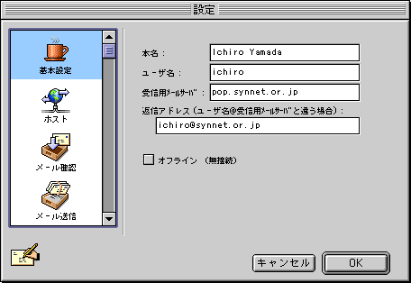 □メニュー左の「基本設定」アイコンをクリックします。![]() ・「本名:」 ローマ字で名前を入力 ・「ユーザ名:」 [ユーザ名](※ユーザIDではありません。) 例)ichiro ・「受信用メールサーバ:」 pop.synnet.or.jp 例)pop.synnet.or.jp 注)利用開始日が、98年5月15日以降の会員の方は、 pop.[サブドメイン].synnet.or.jpとなります。 例)pop.na2.synnet.or.jp ・「返信アドレス:」 [ユーザ名]@synnet.or.jp 例)ichiro@synnet.or.jp 注)利用開始日が、98年5月15日以降の会員の方は、 [ユーザ名]@.[サブドメイン].synnet.or.jpとなります。 例)ichiro@na2.synnet.or.jp ・「オフライン(無接続)」 チェックしません |