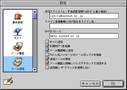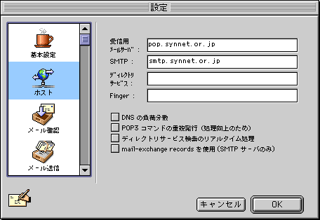 □メニュー左の「ホスト」アイコンをクリックします。![]() ・「受信用メールサーバ:」 先ほど入力した設定となっています ・「SMTP:」 smtp.synnet.or.jp 例)smtp.synnet.or.jp 注)利用開始日が、98年5月15日以降の会員の方は、 smtp.[サブドメイン].synnet.or.jpとなります。 例)smtp.na2.synnet.or.jp ・「ディレクトリサービス:」,「Finger:」 入力しません ※SYNNETでは用意しておりません。 |