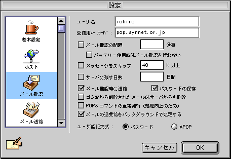 □メニュー左の「メールの確認」アイコンをクリックします。![]() ・「ユーザ名:」 先ほど入力した設定となっています ・「受信用メールサーバ:」 先ほど入力した設定となっています ・「メール確認の間隔」 ダイアルアップ接続ではチェックしません ※チェックしていない場合は、プルダウンメニューの「ファイル」→「メールの確認」を選択すると、新着メールを受信用メールサーバ(POPサーバ)に読み込みにいきます。 ・「サーバに残す日数」 通常チェックしません ・「パスワードの保存」 チェックしておくと便利です ・「POP3コマンドの重複発行:」 チェックしません ・「ユーザ認証方式:」 「パスワード」のままにします |