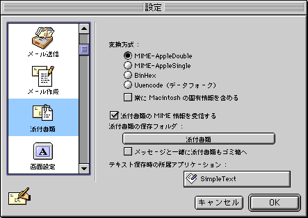 □メニュー左の「添付書類」アイコンをクリックします。![]() ・「変換方式:」 相手が受けられる方式に設定します ※最近では、MIME方式が一般的になりつつあるので、「MIME-AppleDouble」を選択します。 (フリーソフトウェアのEudora-Jへファイル添付する場合は、BinHexとします。) |