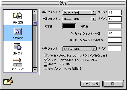 □メニュー左の「画面設定」アイコンをクリックします。![]() ・「表示フォント:」,「等幅フォント」,「印刷フォント:」 例)Osaka-等幅,等幅明朝 ※インターネットのメールでは、等幅フォントが一般的なため、等幅フォントを推奨します。 以上で、基本的な設定は終了です。設定しましたら「OK」ボタンをクリックし、メニューを閉じます。 |