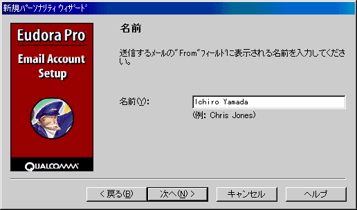 ![]() ・「名前(Y):」 名前をローマ字で入力 例)Ichiro Yamada 設定しましたら、「次へ(N)>」ボタンをクリックします。 |