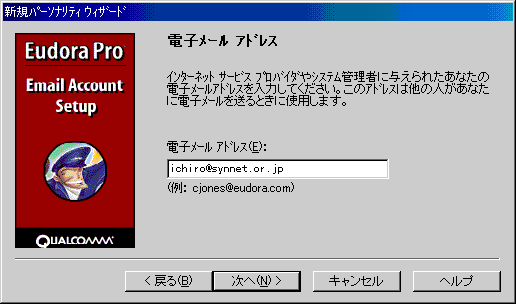 □「電子メールアドレス」のダイアログでは、以下のように設定します。![]() ・「電子メールアドレス(E):」 [ユーザ名]@synnet.or.jp 例)ichiro@synnet.or.jp 注)利用開始日が、98年5月15日以降の会員の方は、 [ユーザ名]@.[サブドメイン].synnet.or.jpとなります。 例)ichiro@na2.synnet.or.jp 設定しましたら、「次へ(N)>」ボタンをクリックします。 |