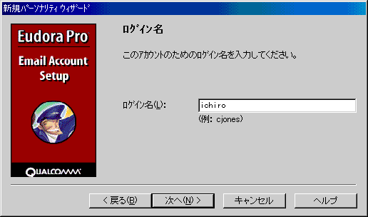 □「ログイン名」のダイアログでは、以下のように設定します。![]() ・「ログイン名(L):」 [ユーザ名]を入力 例)ichiro 設定しましたら、「次へ(N)>」ボタンをクリックします。 |