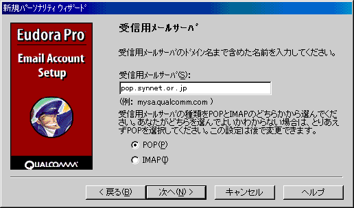 □「受信用メールサーバ」のダイアログでは、以下のように設定します。![]() ・「受信用メールサーバ(S):」 pop.synnet.or.jp 例)pop.synnet.or.jp 注)利用開始日が、98年5月15日以降の会員の方は、 pop.[サブドメイン].synnet.or.jpとなります。 例)pop.na2.synnet.or.jp ・「POP(P)」を選択 設定しましたら、「次へ(N)>」ボタンをクリックします。 |