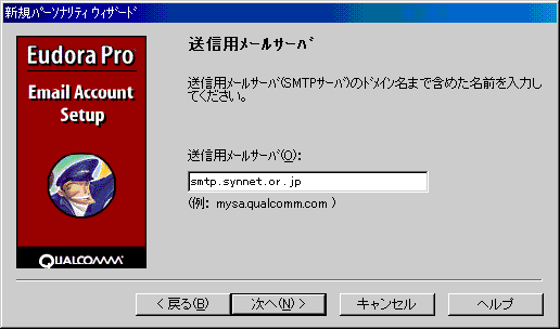 □「送信用メールサーバ」のダイアログでは、以下のように設定します。![]() ・「送信用メールサーバ(S):」 smtp.synnet.or.jp 例)smtp.synnet.or.jp 注)利用開始日が、98年5月15日以降の会員の方は、 smtp.[サブドメイン].synnet.or.jpとなります。 例)smtp.na2.synnet.or.jp 設定しましたら、「次へ(N)>」ボタンをクリックします。 |