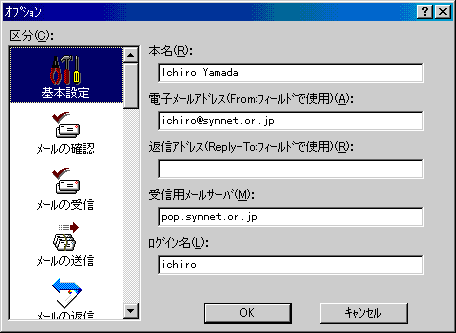 □「区分(C):」より「基本設定」アイコンをクリックし、以下のように設定します。![]() ・「本名(R):」 ローマ字で名前を入力 ・「電子メールアドレス(From:フィールドで使用)(A):」 [ユーザ名]@synnet.or.jp 例)ichiro@synnet.or.jp 注)利用開始日が、98年5月15日以降の会員の方は、 [ユーザ名]@.[サブドメイン].synnet.or.jpとなります。 例)ichiro@na2.synnet.or.jp ・「返信アドレス(Reply-To:フィールドで使用)(R):」 通常は設定しません ※「電子メールアドレス(From:フィールドで使用)(A):」で入力した、電子メールアドレス以外に返信してもらいたい場合に、返信先のアドレスを入力します。 ・「受信用メールサーバ(M):」 pop.synnet.or.jp 例)pop.synnet.or.jp 注)利用開始日が、98年5月15日以降の会員の方は、 pop.[サブドメイン].synnet.or.jpとなります。 例)pop.na2.synnet.or.jp ・「ログイン名(L):」 [ユーザ名] (※ユーザIDではありません) 例)ichiro |