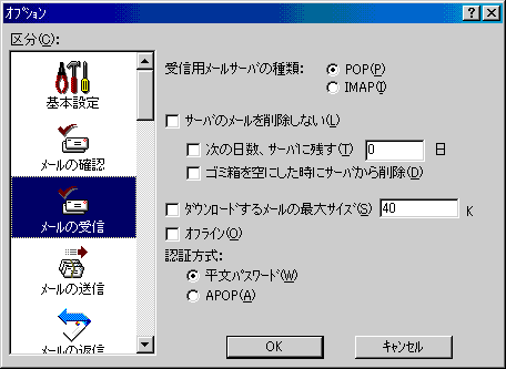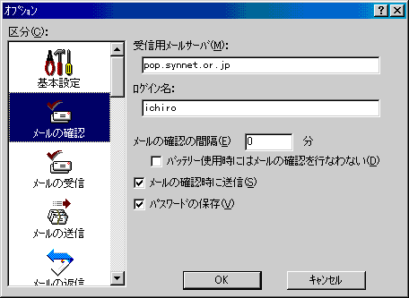 □「区分(C):」より「メールの確認」アイコンをクリックし、以下のように設定します。![]() ・「受信用メールサーバ(M):」 先ほど入力した設定となっています ・「ログイン名:」 先ほど入力した設定となっています ・「メールの確認の間隔(E)」 ダイアルアップ接続では 0 分 にします ※0 分にした場合は、プルダウンメニューの「ファイル(F)」→「メールの確認(M)」を選択すると、新着メールを受信用メールサーバ(POPサーバ)に読み込みにいきます。 ・「パスワード保存(V)」 チェックしておくと便利です |