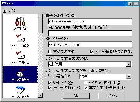 □「区分(C):」より「メールの送信」アイコンをクリックし、以下のように設定します。![]() ・「電子メールアドレス(R):」 先ほど入力した設定となっています ・「ドメイン名省略時に付け加えるドメイン名(D):」 通常は入力しません ・「SMTPサーバ(S):」 先ほど入力した設定となっています ・「すぐに送信(I):」 ダイアルアップ接続で利用する場合は、通常チェックしません。 ※チェックを外すと、「メッセージ作成」ウィンドウの「送信」ボタンが「あとで送信」に変わります。送信待ちメールを送るには、プルダウンメニューの「ファイル(F)」→「未送信メールを送る(Q)」を選択を選択します。 ・「QPの使用を許可(Q):」 通常はチェックしません |