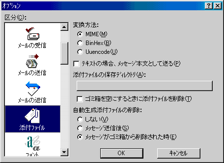 □「区分(C):」より「添付ファイル」アイコンをクリックし、以下のように設定します。![]() ・「変換方法」は相手が受けられる方式に設定します 最近では、MIME方式が一般的なので、通常「MIME(M)」を選択 |