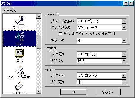 □「区分(C):」より「フォント」アイコンをクリックし、以下のように設定します。![]() 「メッセージ」の枠内 ・「デフォルトでプロポーショナルフォントを使用」 通常はチェックを外します 「プリンタ」, 「画面」の枠内 ・「フォント」 お好みで設定しますが、固定幅のフォントを推奨します 例)MSゴシック,MS明朝 ※インターネットのメールでは、一般的に固定幅のフォントを利用します。 |