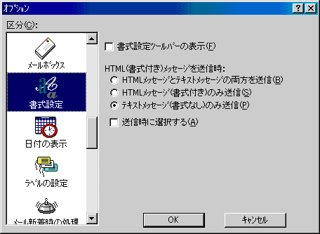 □「区分(C):」より「フォント」アイコンをクリックし、以下のように設定します。![]() ※送信先のメールソフトが、HTMLメッセージのメールに対応していないと、相手先で正しく読むことができません。誤ってHTMLメッセージを送らないようにするには、次のように設定します。 ・「書式設定ツールバーの表示(F)」 チェックを外します ・「HTML(書式付き)メッセージを送信時:」「テキストメッセージ(書式なし)のみ送信(P)」を選択 ・「書式時に選択する(A)」 チェックを外します 以上で、設定は終了です。設定しましたら「OK」ボタンをクリックし、メニューを閉じます。 |