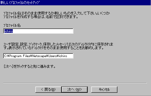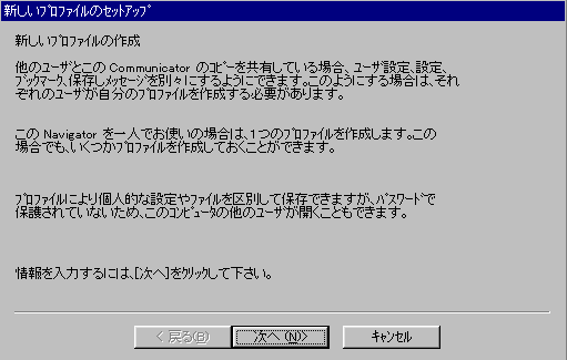 ※Netscap Communicator 4.0では、複数のユーザ設定を作成することが出来ます。「スタート」メニューから「プログラム(P)」-「Netscap Communicator」-「Utilities」-「User Profile Manager」を起動します。新しいユーザのプロファイルを作りたいときには、「新規作成」ボタンをクリックし作成します。