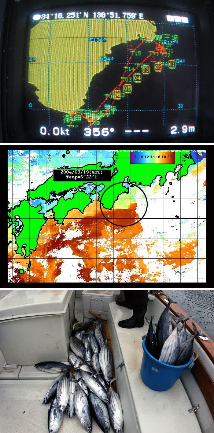 ![]() | 3月19日〜21日に今年最初のカツオ釣りに出かけてきました。上段の写真がGPSのビデオプロッターの画面です。左上の黄色の所が紀伊半島で右上が三重県の大王町、そして左下が和歌山県の串本です。 赤の線が今回のカツオ釣りの航跡です、そう!和歌山県(70マイル)まで行ってきたのです。中段の写真は当日のNOAAの海面水温画像です。この時期は串本(潮岬)まで出ないとカツオのいる水温(写真の茶色の部分)にとどかないことが分かります。 19日(金曜日)夜12時に出航しました、真っ暗で何も見えない。そろり、そろりとブイを避けながらやっとのことで外海に出る。いつも走っている外海も真っ暗では勝手が違い、「突然目の前に岩が」の恐怖が頭から離れない、ひっきりなし通る貨物船も避けなければならない、時速15ノット(約27km)で我慢と忍耐の航海が続く。 朝5時に串本の並びにやっとのことで到着、暗いうちから仕掛けを出し早速トローリングを始めた、しかし2時間、3時間経過するが、何も食わない。 「黒潮の上に乗れば入れ食い状態になる」・・・・・は錯覚だったのか?。鳥山とナブラに乗せてもどポツリ、ポツリとしかカツオが釣れない、食いの悪いカツオ。 「おーい、何も食わんぞ!」と無線で時々泣きが入る、状況が悪いようなので早めに切上げ、明日に備えることにする。 串本港に入港し良さそうな場所に舫を取り、燃料補給と仕掛けの修理をしてから、電気炊飯器でご飯を炊く(発電機を持って行った)。 その間に歩いて温泉へ、帰りにスーパーでキムチとキビナゴの刺身を買い込み、釣ったカツオを刺身にして一杯が始まった、釣ったカツオの刺身のうまかったこと。 翌日は朝4時に起床、昨日の雪辱を期すが中々釣れない、昼近くになり大きなナブラを見つけやっとのことで20本近くのカツオを釣ることができた(下段写真)。 だけどほんと・・・・・・・・・・・仕事よりえらいわ。 |