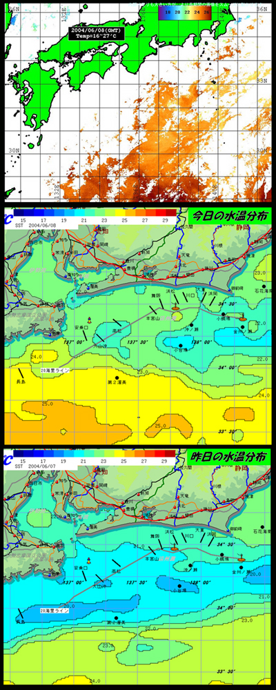 ![]() | 紀伊半島周辺は今年はカツオがさっぱりです、全く釣れないと言っていいでしょう。 今年はキロ1500円もする時があるそうです、例年安い時にはキロ300円以下などといった日があるわけですから、今年のカツオは私たち素人には釣れないはずです。 4/11カツオ8本、4/18カツオ20本、5/23カツオ11本、5/30全くのボウズと結果は惨澹たるものでした。 特に5/30は50マイル(約90Km)以上沖出ししましたが、全くだめ。水温、水色、鳥山(沢山の鳥が飛んでいる)、と状態はいいのに魚がいないのです。 10時過ぎになって、「そういえば漁師が今日は出ていない」ことに気ずく、無線で呼んでも応答なし。昼過ぎになって「そうか、今カツオが釣れてないのかも」と気ずく。 直近の情報を入れとけばよかったと基本的なミスを悔やんでもしょうがないよね〜、自分だけは釣れると信じている所があるから。 左の3枚の図は水温の分布図です。 上:三重県科学技術振興センター水産部のホームページにあるNOAAの水面水温画像です 当然天気(雲がある)が悪いと画像が真っ白になってしまい何がなんだか、分から なくなってしまいます 中:しかし、最近見つけたのです。浜名湖の鈴木マリーナのホームページには赤外線? による水温分布図が出ているのです、これならNOAAがだめでもOKだ 下:それも前日の水温分布図と瞬時に比較できる、これなら潮の動きも把握できる スゴイ! これがあって直近の情報を取るのを怠った。 昨日、70過ぎの女性の患者さんから「先生!カツオつれないでしょう」と言われた 「何で知っとるの」と私。「今年は餌のイワシが多くてカツオお腹一杯なの」、「・・・・」と私。「お腹一杯なカツオ、先生の疑似餌に見向きしないわよ〜」だって。 心身ともにへこたれている私は妙にしんみりと納得したのであります |