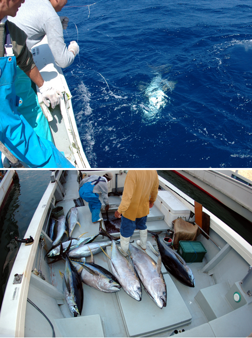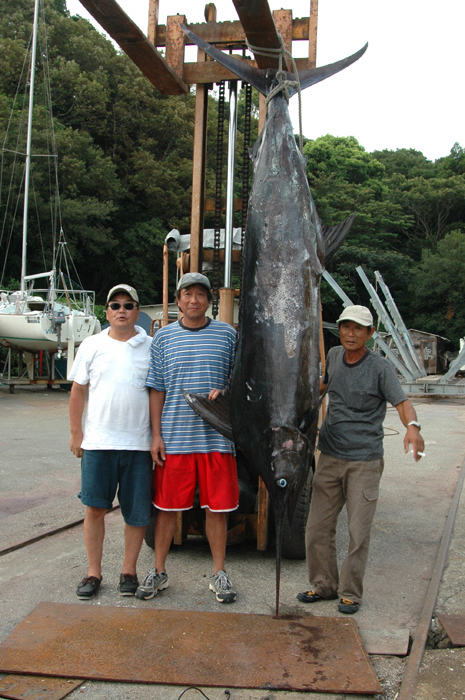 ![]() | 8月15日に今年最初のカジキ釣りに出たものの、台風の影響でかなりのうねり。前日の飲み過ぎもたたって、船酔いがひどい、またまた吐きながらの釣りになってしまった。ちょっと仕掛けをいじっているとひどい吐き気がして釣りに全然集中できない。 同僚も平気な顔をしながら「鼻からゲボが出た」などと言い出したので、この日は早めに切上げ昼過ぎにはハーバーに逃げ帰る・・・・・アア情けない!。 翌日(16日、月曜日)はアネロン(酔い止め)を早めに飲んで出航、初めて乗ったゲストから「こんな釣りする人が酔い止め飲むの初めて見た」と感心される。 昼12時近くばててキャビンで寝ていたら「村井さん仕掛けがおかしい」と起こされる、仕掛けがそっくり切られて無くなっている、カタンといっただけでリールの音は全くしなかったと言う。おそらくラインがどこかに絡まっていたのだろう・・・・ひょっとして・・・・・。 急いで仕掛けを作り直しセットする、今度は5分もしないうちにヒットカジキが凄いジャップを繰り返している、時計を見たら12時15分だった。 45分程経過してあと150メータ近くまで寄せてきて、もうそろそろと思っていたら今度はカジキが垂直に潜りはじめた、300メーターほどラインが出て動かなくなってしまった、下で死んでしまったようだ、カジキは誇り高き魚だという。 3人がかりでやっとの思いでカジキを浮かせ、船に取り込んだときは2時すぎでした、180歳トリオ1時間45分の激闘でした。 |