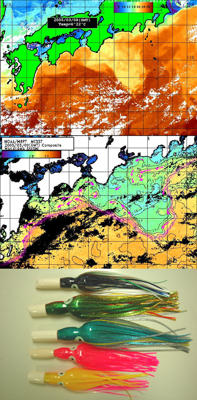 ![]() | 去年挑戦できなかったトンボ鮪釣り、今年はジャンボ(トンボ鮪用の仕掛け)も用意してぐすねひいて待っていたのですが、今年は魚場が遠すぎて駄目でした。もうすでに3月ですから今年のトンボはもう終わりのようです。 さ〜それではカツオはと見回しても良い情報は無いようです。去年の今頃はすでにカツオを釣っていましたからちょっと心配になってきます。 3月8日のNOAA画面を見ても紀伊半島で黒潮が大きく蛇行してしまっています、まるで私たちから逃げるように大きく沖にいってしまっているのです。 まん中の写真は和歌山県農林水産総合技術センターのホームページの海況速報(3/9)の状況です。こちらは解説が加えられているので上下を見比べていただくとよく理解できると思います。ピンクの帯が黒潮本流で、矢印は黒潮の反転流を示しています。 潮の状態から推測すると九州宮崎沖、四国室戸岬、伊豆下田沖、あと反転流が入り込んでいる御前崎沖だと推測されますがいずれにしても遠すぎます・・・・・。 高知の状況を問い合わせてみても沖でちょっと漁があるぐらいだ・・とパットしない。 下の写真はカジキ用の象牙のルアーです。今シーズン用に自分で作ったものです、なかなかの出来映えでしょう!。 私の友人が「象牙をルアー・・・・・もったいない話だわな〜」と言いながら、象牙の無垢材を五つヤフーのオークションで格安で見つけてくれたのです。 好きな形に整えるのは技工用のモデルトリーマーが最高でした。タコの取り付け部分の加工は即時重合レジンが大活躍でした。即重と象牙の界面はエッチングしてスーパーボンドあるいはパナビアで接着・・・とこだわりましたが今回はアンダーカット形成だけで勘弁してやることにしました。 今年はこのルアーでカジキ大漁まちがいなしの予感がしています。 |