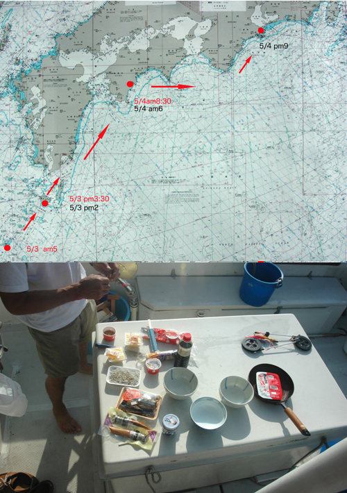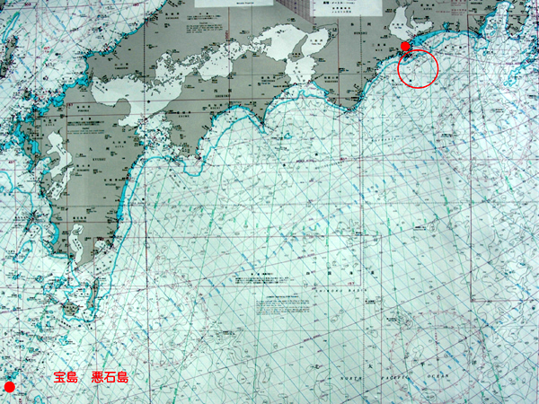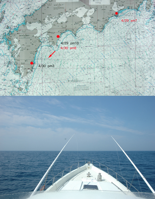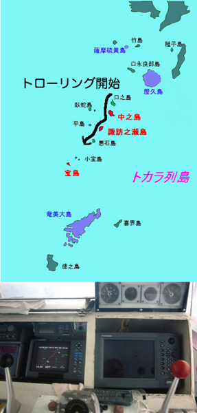 ![]() | 私たちのホームポートは三重県の大王町(右上の赤点)にあります。そしてそこを中心にして赤い円の辺りをいつも釣りのエリアにしています。カツオの時期は60〜70マイル出ることがありますが、カジキはほとんど円内の近場でやっていることが多いのです。大きなカジキは遠くに行かないと釣れないと思いがちですが、そうではありません。近い時は5〜6マイル(約8km)、遠くても30マイル(約50km)近辺までしか沖出ししません。 そんな訳で、いつも決められた狭い範囲の釣りに「ア〜ア、いつかは自分たちの船で遠くに行きたい・・・・・」と不満とも夢ともつかないモヤモヤを持っていたのです。 いつも、酔っ払うと気が大きくなり、覚めると萎んでしまう、なさけない自分たちの夢だったのです。 しかし、今年は気合いが入った。先日のゴールデンウィーク(4/29〜5/5)、トカラ列島の宝島(左下の赤点)に釣りに出かけて行く計画を実行したのです。 さすがに一人では自信がなく、いつものクラブの世話人のT氏に付き合ってもらい、2人で出かけることに。前の晩、結構遅くまで2人で飲んで・・・・朝出がけにサークルKで水と食料(インスタントラーメン)を買出しする。何というこの不用心、そしてこの慢心。 |