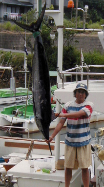 ![]() | 今カジキが入っているとの情報が入る。チャンスを逃してはと、7月17日(日曜日)気になって入る作業があったが、ほったらかして、今年最初のカジキ釣りに出かけた。朝方かなりガスっている、熊野灘のタンカー事故の直後でもありレーダを回しながら注意深く14マイルほど真南に出す。さいわい沖はガスも晴れて一安心。仕掛けを出して無線を聞いていると他の船は皆、東でやっているようだ。自分の感を信じてこのまま南でやることに決める。 沖に出すにつれて、海面の状態が単調になってきた。途中7マイルあたりの潮目まで戻ることに。意地を通しているので回りには船は全くいない、独り船。 10時頃突然,バチンと凄い音、リールがうなり声をあげている、後ろを見ると300m辺りで激しくジャップを繰り返している「カジキ!」だ。急いで他の道具をかたずけ、カジキとファイト。運良くカジキが風下で食ってくれたため、船をふかしているとどんどんカジキに寄っていく10分ほどで手元によってきた。銛を打って船に上げたのが何と15分後、あっという間の釣りでした。今までで最小(60kg)のカジキでしたが、独りでやった初めてのカジキだったのです。 この後魚が釣れなければ、宝島釣行記を連載する予定です。 |
