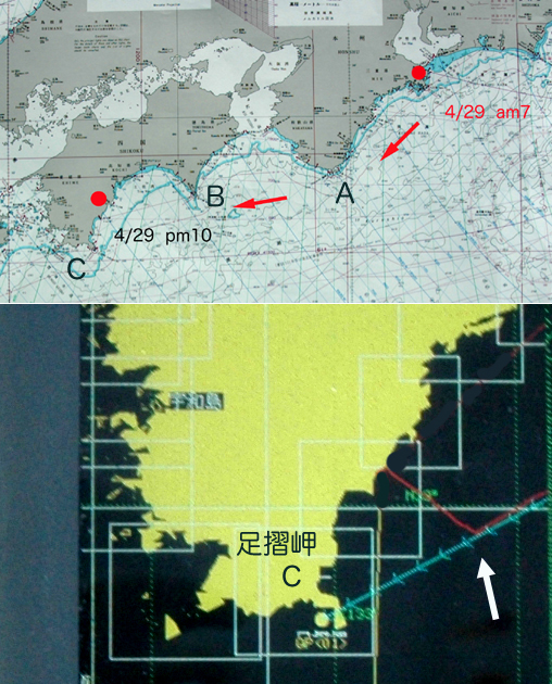 ![]() | A:潮岬 B:室戸岬 C:足摺岬 6時に基地に集合して出航の準備をする。出がけに漁協組合で燃料と氷の補給を済ませて時計を見たら午前7時だ。「さ〜これからいよいよ宝島だ」めずらしくちょいと興奮する。潮岬まで真向かいの風と波、すごく走りずらい。道中長いので焦らないように自分に言って聞かせる。潮岬の串本に着いたのが午前11時半、波の無い港のなかで船を止め昼食を取る。20分もいただろうか・・・のんびりできず、すぐ出発。 今度は四国の室戸岬に向けて走りはじめた。風と波がやや左にふれ随分走りやすくなった「何か気分がいい!」。午後4時ごろぼんやりと室戸岬が見え始めた。「室戸岬港で燃料を補給して今日はここで泊まりだ!」当然そう考えていた。 室戸岬港に入港して燃料補給を頼みにいったT氏が「頭にきた、燃料は5時まで5分過ぎたからダメと言われた」とえらい剣幕で戻ってきた。「今日はここに泊まって朝燃料補給しよう」と私。気持ちの治まらないT氏は燃料タンクのゲージを見て「まだ燃料半分残っている、大丈夫や土佐清水(足摺岬)まで行ける」、「ダメ燃料足らないと思う」と私。しばらく沈黙が続いたが、T氏に押し切られる形で出航する。暫くすると陽も落ち真っ暗に・・・・・。3時間ほど走っただろうか、突然右のエンジンが止まる。T氏が「右のシフトがおかしい」、「いや違う、ガス欠だと思う」と私。急いで燃料タックのチェックをしたT氏が「燃料空だ!」。重ぐるしい沈黙のなか。左のエンジンにはまだ燃料が残っている、左のエンジンだけで行こうということに。 しかし、舵を左に一杯に切っても船は右にクルクル回るだけで真っすぐ走らない。「漂流」「遭難」「新聞沙汰」・・・・万事窮す・・・。 |