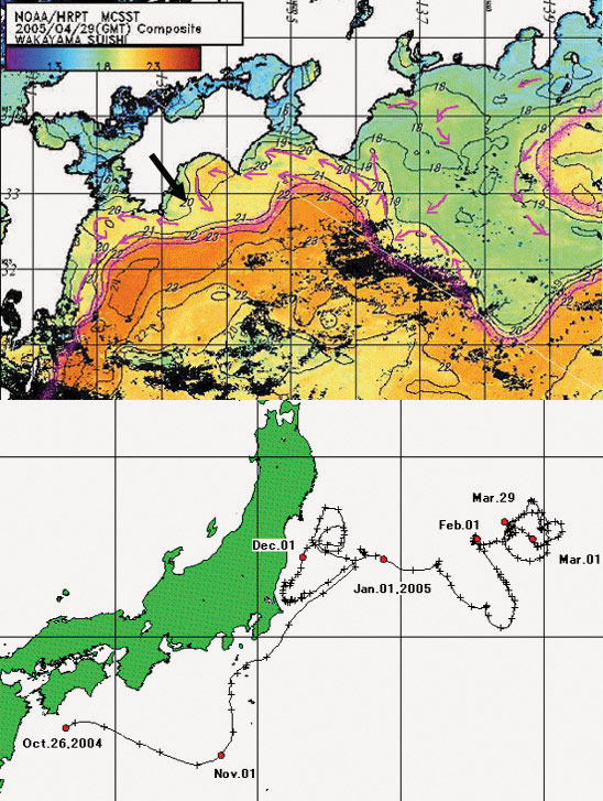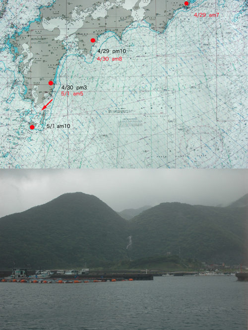 ![]() | 上の画像は土佐沖でガス欠を起こした4月29日の黒潮の流れです。(NOAA画面:もちろんこの画像は無事に帰って来てから手に入れたものです) 黒潮はパープル色で示されており、熊野灘沖で大きく蛇行しています。問題は私たちがガス欠を起こした土佐沖(矢印)の潮の流れです。黒潮が左から右へ流れる時に沿岸の海域はそれとは逆の反転流が生じています。土佐沖は岸から沖へ反転流が流れ黒潮に吸い込まれて行くような流れになっています。 恐らくガス欠のままなら一晩で黒潮本流にのってしまっていたでしょう、怖い!。 クルージングから帰ってきて,何げなく海上保安庁のホームページを見ていたら、恐ろしいページを見てしまった(下の画像)。 これは海上保安庁がブイの漂流実験をしたものです。2004年10月26日に土佐沖で放流させたブイが日時の変化とともにどう流されているか一目瞭然です。 これを見て「ああ、おれたちもこうなっていたんだな〜」とひどく感激した。 4月29日のガス欠から約1ヶ月後、宮城、茨城沖でに日本が見えるとこまで近ずくもそれからは少しずつ沖に流され、3ヶ月後の7月には仙台沖の遥か東方海上に流されることになっていたはず。じりじり照りつける夏の太陽の下でT氏とわたしはヒモノになっていたのでありましょう |