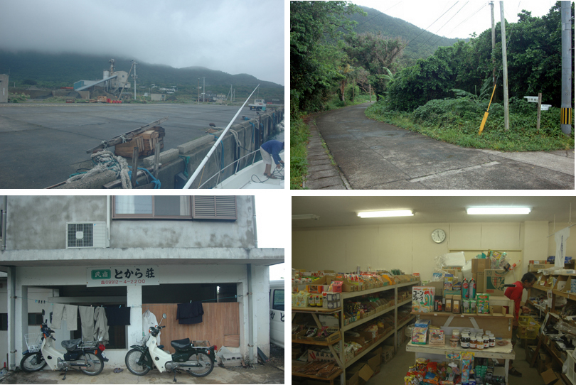 ![]() | やっとたどり着いた宝島はこんなところでした。港に舫を取ってふと見てみると、セメント工場(左上)。宝島という名に憧れて来たんだから、何もこんな所に作らなくても・・・とぶつぶつ。 とにかく、電圧のドロップした原因をみつけ修理をしなければならないので2時間ほど整備に没頭する。 上陸して島をちょっと歩いてみると、バナナの木が野生に生えていたりしてなんとなく南の島という雰囲気も漂っている(右上)。 この日泊まることになった「とから荘」(左下)。ご主人と奥さんが夕方軽四で港まで迎えにきてくれた。何となく怒ったようにしゃべる奥さんが「特別扱いでお風呂に入れてあげる」といっている。特別?風呂?・・・島の様子が分からないのでよく理解できない。民宿について風呂にいってみると、100リットルあるだろうかと思えるほど小ちゃなおふろ。風呂は2日か3日にいっぺん、普段は水を浴びるだけというから,なるほど特別か〜と理解する。怖そうに見えたご主人も話をしてみると面白い人、食事も結構美味しくて、最初馬鹿にしたのをおおいに反省する。 買い物は夕方5時から6時まで1時間しか開かない農協(右下)ですることに、置いてあるものを見て「日本と一緒だ!」と変な感動をする。 翌日朝4時半に民宿を出発、何とご主人と奥さんが両方で見送りに来てくれた。別れ際に奥さんから黙って弁当を手渡された。言葉では何も言わなかったけれど「気をつけて帰るんだよ!」と言っているのが痛いほど伝わった。 |