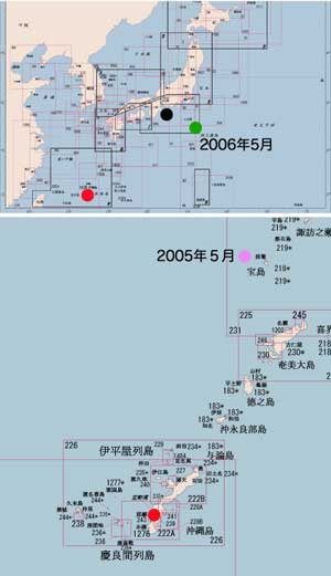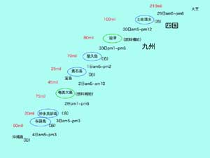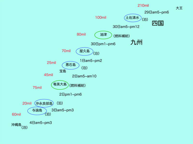 ![]() | 4月の29日から5月6日までの8日間、甲賀丸で沖縄まで釣りに出かけてきます。 三重県の大王崎から沖縄の宜野湾まで約700マイルです。海上マイルですから700×1.8=1260Kmあります。 一昨年は燃料補給に苦労したため、今年は燃料補給を考慮し作った行程表が左の図です、もちろん天気しだいなので動ける時には予定を変えて夜通し走らなければならないこともあるかもしれません。 とにかく、今年は片道なので無理をしないようにしました。一昨年思い残した悪石島にも上陸し宿泊する予定です。そして一度は行ってみたいと思っていた沖永良部島や与論島にも立ち寄る予定です。 5月、もうむこうは初夏でしょう。ゴールデンウィーク、海よ静まれ! (図をクリックすると拡大できます) |