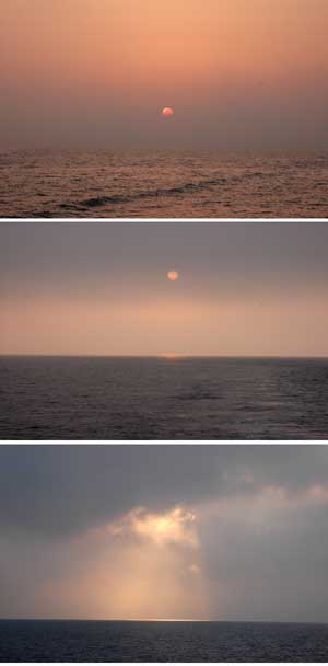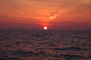 ![]() | 28日仕事を終えて車で基地へ出発した。途中、同僚のT氏から電話がかかる、「お願いがあるんやけど」・・なにい・・「一人同行したい人がいるんだけれど乗せってってくれん」・・・エエエッ、何も前日に言ってこなくても。 聞けばダイビングのインストラクターだという。どんな人、性格は?。電話では要領を得ないがいちかばちか了承をしてしまった。何もかも二人分しか用意してない、どうなるんだろう。 29日、燃料を補給して出航したのが午前5時、時間もピシャリときてこれならやっていけるかもしれないと感じた。 この日は波もなく絶好の日和になった、沖合で迎えた日の出です。 |
