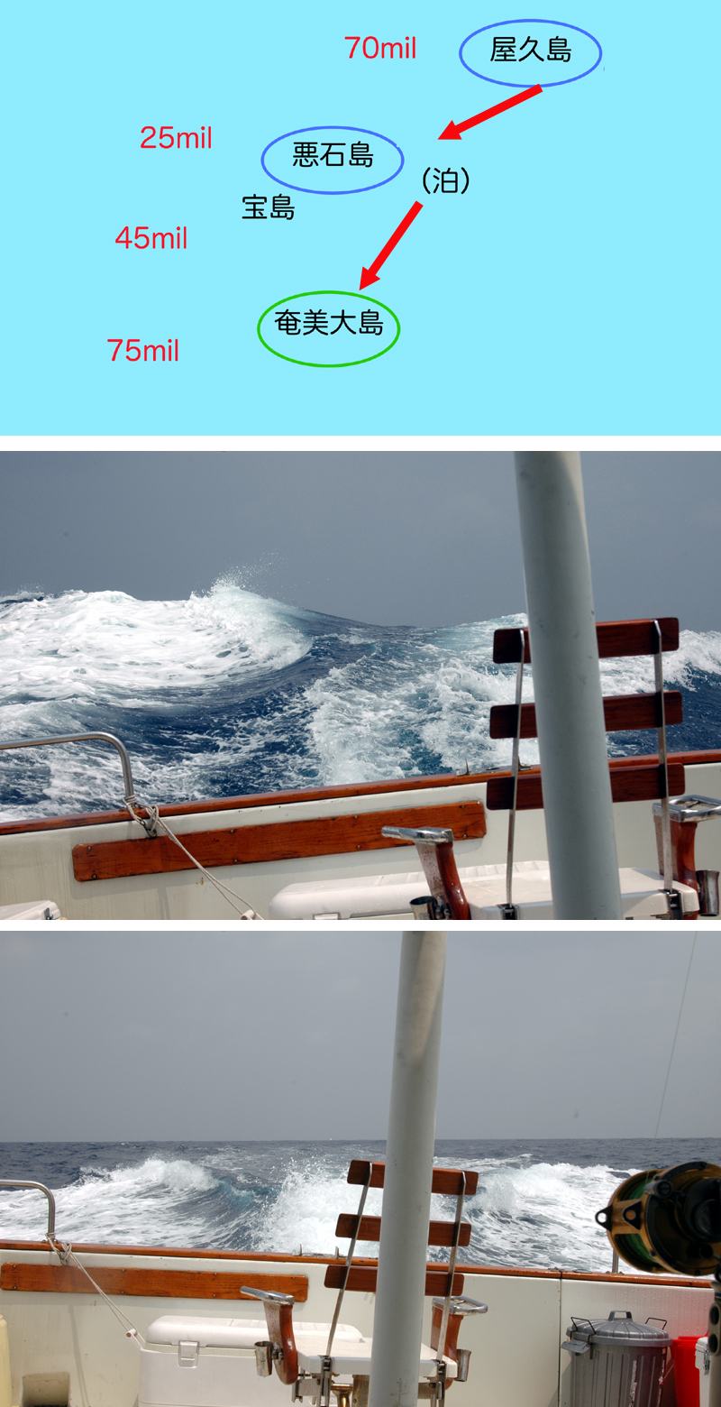 ![]() | 朝起きると、屋久島は今日も強い風が吹いている。低気圧の前線がまだ通りすぎていないようだ。しばらく様子をみていたが日程の遅れが気になってしょうがない。7時半まで我慢したが出航することにする。「奄美大島は天候が回復している、だいじょうぶ」と自分に言ってきかせる。 港を出ると凄い波、一瞬ひるむ。「ここは浅いから特にひどいのやらろ〜」とのT氏の言葉を信ずるしかない。 水温が26℃近くまで上がって来る時がある、黒潮のど真ん中を走っているようだ、水温が上がって来ると波が高くなって来る、黒潮の流れと風が逆になっている所が特に凄い波になっている。 悪石島に向けると右前から波がきて走れない、左に少し落とせば楽になる、再度悪石に向けるとまた辛くなる、その繰り返しを何度もくりかえす、しかし「こりゃ〜だめだ、奄美に逃げよう」と遂に悪石島を断念し、奄美大島に向かうことになってしまったのです・・・・・・・残念。 中の写真:最悪の所を抜けだして少し落ち着いてきたところで 撮った写真です、大きな波がスターンからドドドーと 襲って来るのです。 下の写真:奄美大島に近ずくにしたがって波が無くなり走り易く なってきました。本当はまだ結構波があるのですが、 写真に撮るとこんな感じになってしまうのです。 |