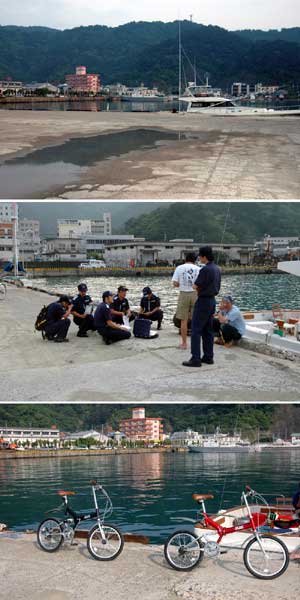 そういえば自分はもう5日も風呂にはいっていない、近くに風呂屋があるというので歩いて出かけることになった。 さっぱりして食料を買いたしそのまま食事をするかどうか迷ったが、とりあえず船に荷物を置いてから出かけようということになり、船に戻ると待ちかまえたように海上保安部の職員が7人も来た、何だろうと思っていると「書類を見せて下さい」という。そして書類を広げ即座に写真を撮り始めるではありませんか(中の写真)。 「あなたたち何処から来たのですか」「三重県から」。「あなたたち航行区域違反ですよ」「エエエッツ」。 甲賀丸は漁船登録してあるけれど、航行区域が12マイルまでとなっているので宝島から奄美大島までの間が宝島からも奄美大島からも12マイルではとどかないので違反なのだという。「書類は預かります」「明日9時から取り調べをしますので保安部まで来てください」とのこと。翌日朝9時から始まった取り調べは昼食をはさんで何と4時までかかったのです。調べたことは 1)何処から何処を通ってここまで来たのか 2)何故、航行区域違反であることに気ずかなかったのか の2点だけなのです、それに6時間もかかったのです。聞いてはいたけれど悪評高い海上保安庁の取り調べに精気を全部吸い取られていくのです。 聴けば、甲賀丸の動向はすでにマークされ屋久島や種子島を何時に出航したのか通報されていたようです。 上陸したときに島の中を走り回れるように用意した自転車が「取り調べ」の足になるとは・・・。 この取り調べに要した1日が唯一風も波もない絶好の釣り日和の1日だったのです。 |
