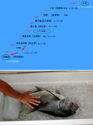 ![]() | 海上保安部での取り調べが終わったのが午後4時。当初、奄美大島で船を拘束すると言っていた海上保安部が沖縄までは島ずたいに行けば12マイルの範囲内で航行できるので行ってよろしいと許可が出たのです。そして「ここは密入国や薬(麻薬)の多いところ、どうしても取り調べが厳しくなります気を悪くせんで下さい」「気を付けて行ってください」と優しく送り出されたのであります。 こんないい日「クソー」。これ以上精気を吸い取られたらへこたれてしまう、すぐ出航するぞ!。 名瀬を出たのが午後4時半、沖永良部島まで行くことになった。この日は月明かりで結構視界がきいて快適なクルージング、5時間で沖永良部島の知名港に入港できた。 「夜、入港するなら沖永良部の知名港がいいですよ。与論島はリーフが多いのでお勧めできません」と例の海上保安部からアドバイス受けていたのです。 翌日、港を出てすぐ仕掛けを出した。今回のクルージングで初めて仕掛けを出すことができた、与論島をかすめながら沖縄に向けてトローリングが続くのです。 水温、鳥山、潮目、どれもパッとしない海が続くけれど、仕掛けを出しているいることが嬉しくて、気分の良い時間がゆっくり流れる。昼近くぼんやりと沖縄本島が見えてきた、「本当に来たんだ!」。伊平水道を通過しているときに左右のマグロ用の仕掛けにヒット、片方はばれてしまったが、もう一方の仕掛けで釣り上げた魚です4〜5Kgのローニンアジ(GTともいう)でした。 結局、今回の釣行で釣れた魚はこれだけ、情けない結果になってしまいました。天候が悪くトカラ列島での釣りができなかったことが一番悔やまれるのであります。ああそれと・・・・・・・・海上保安部。 飛行機で行って陸から見た宜野湾港マリーナに甲賀丸で海から入って行けたのは私にとって特別なものでした、5月4日午後5時半のことでした。 |