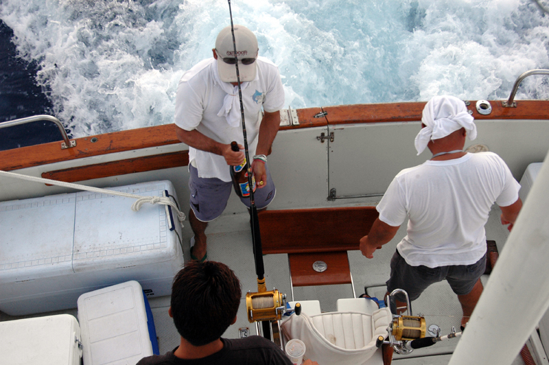 ![]() | 6月10日、11日の2日間、2回目の沖縄に行ってきました。そして何と、二日間で5匹のカジキを釣り上げたのです。その様子は次回にお見せします。 10日の朝4時出発の予定だったのですが2人が寝坊、5時の出航となってしまいました。さ〜出航しようとマリーナを出始めたら、助っ人3人が何か始めたのです。 泡盛の一升瓶をラッパ飲みしたあと、海に一礼して泡盛のお裾分け、そして次の助っ人が又ラッパ飲み、そんなことを繰り返しているのです。この3人、海に感謝して仁義を切ったのです。 |