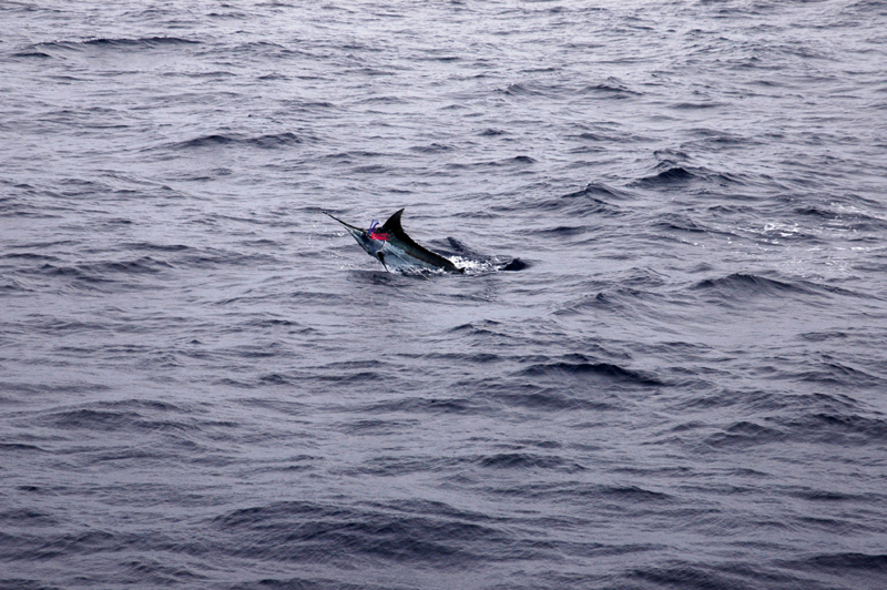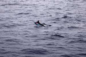 ![]() | 60Kg弱の小さいカジキは大変元気がよく、このように手元に寄って来てからもジャンプを繰り返します。 最後まで徹底的に抗戦する姿に申し訳ないと感じてしまうのです。 東京のK先生に5匹釣ったと自慢のメールをいれたら、「かじき側にたってその将来を考えたりしなくても良いのだろうか」と返事がきた・・・・・・・。 |
