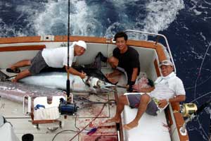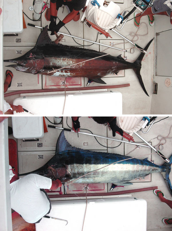 ![]() | 上の写真 カジキをランディングした直後の写真です。この3人は生きたままランディングさせてしまうのです、強い。 下の写真 とどめを刺すと、一瞬このようにコバルトブルーに変色するのです。 |