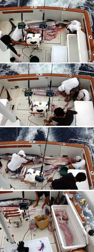 ![]() | この3人は釣れたものを海に返すなどと行った発想は微塵もありません。海の狩人で、捕っているのは食べものなのです。 釣り上げるやいなや、鰓を取り、内臓をきれいに洗い「内臓はホルモンと一緒、おいしい!」などと言いながらビニールの袋に小分けしながらクーラに入れていくのです。 だいぶ解体が進んだ時、2匹目のカジキが釣れてしまったのです。かれらは前のカジキを放っといて新しいカジキの鰓と内臓を出し始めたのです。そこまでやっておいておもむろに前のカジキの解体に戻るのです。ほんと、この3人のフォーメーションと動きが絶妙なのです(3番目の写真)。しかし船が生臭くなる、私は「ここは水産解体工場か」と言いたいのであります。 1時間もすると2匹のカジキは、きれいな切り身になりビニールの袋に収まり氷ずけされるのです。 今回は泊まりがけの釣行であったため、2日間でおよ400Kgの食料を確保したことになるのです。 3人が海に感謝をする仁義は、食べ物の恵みに感謝をしていたのだと分かったのです。 |