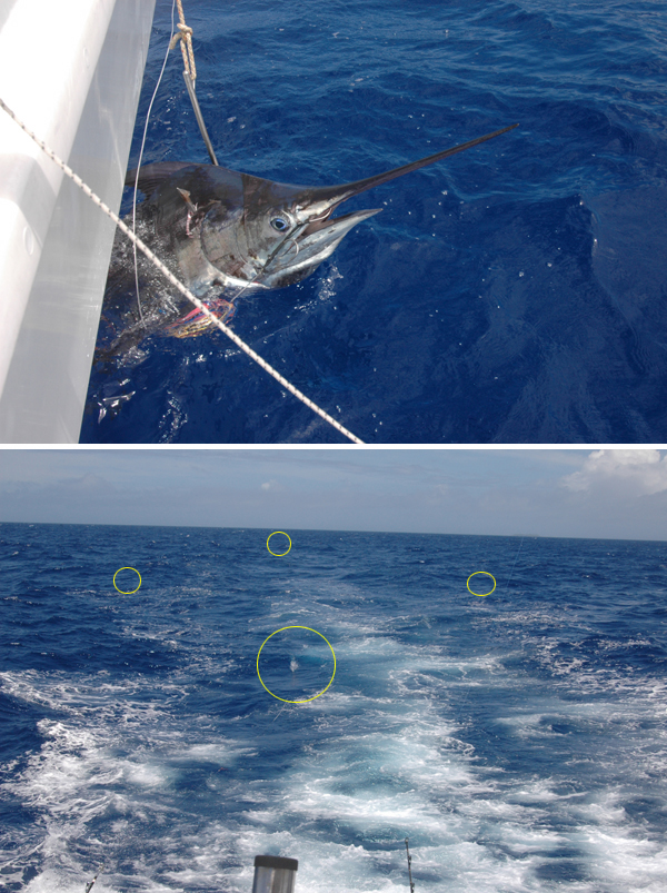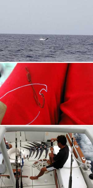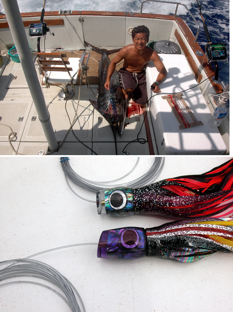![]() | カジキ釣りは最後手もとに寄せてこのように(上の写真)ギャフを打ちます。この状態で、今度の新しいS助っ人はカジキが死ぬのをじ〜とまっているのです。大変慎重な人なのです。「何度も周りが怪我をしたので慎重になってしまったのです」と言うのです。 カジキ釣りのルアーの配置のひとつのパターンです。4本のルアーを流していますがほとんどのカジキが一番船の近くのルアーに来るのです、船を怖がらないというか、無神経なのか、船から5メーターぐらいでもヒットすることがあるそうです。 さて4回の釣行で計7回(1回は天気が悪かった)のカジキ釣りをしました。そして9本のカジキを捕ったのです。今まで20年近くやっていて12本ですから凄いペースです。 9本目のカジキはA助っ人が大きなブロックにして60Kgほど宅急便で送ってくれました、スタッフ、知人、現場監督、植え木屋、設計士、皆で分けて食べた、絶品のカジキマグロだったのです。少しゴマをすったのでさ〜もう一度。 |