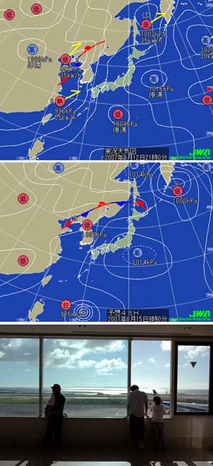 ![]() | 8月10日朝一番の飛行機で沖縄に向かう。6日間の休みだ、4回は釣りに出れる、嬉しくてちょっと興奮している。 まもなく着陸しますと機内放送が入る、ふと下を見ると海が真っ白にしている、「エエエ、そんなバカな!」、週間天気予報では沖縄は全部晴れマークだった。 マリーナに着いたらNさん(釣りの名人)から電話、「今、久米島にいる、朝起きて天気が急変しているので驚いている」「飛行機が飛ばないかもしれないので早く那覇に戻るつもり」「村井さんも一度帰った方がいい、この様子じゃ〜火曜日ぐらいまで出られないだろう」などと言う。まだ今日は金曜日、火曜日なんてそんな・・・・・まさか。 一番上の天気図は8月12日のもの、11日から14日までこの天気図のままだったのです。すさまじい雨と風、消防車が走り回っているので何だろうと思っていると、近くで車が水没して救助しているとのこと。この時、沖縄では1年分の雨が1日で降ったという。 その後、陸の天気は回復してきたが海の状況は波5メートルが5日間も続き最悪のお盆休みになってしまったのです。 この時、内地は晴天続き「タオルが1時間で乾くよ」だって、モー。 15日(水曜日)は帰る日、朝11時の飛行機を夕方5時半に変更して最後のチャンスにかけた。台風が近ずいて来ており、波4メートルうねり伴うの中で出航したのです。しかし朝5時から12時半まで粘ったけれど結局ヒットなしで終わってしまった。 帰り、非肉なことに那覇の空港から見えるケラマ諸島(いつも走り回っている海)が穏やかにキラキラと輝いていたのです。 |