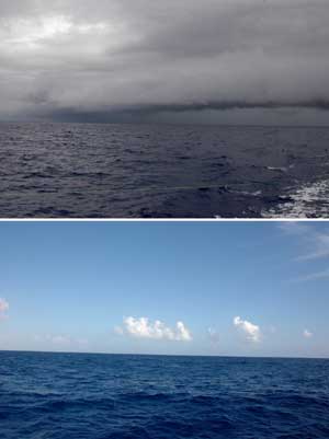 ![]() | 陸上ではめったに見られない光景です(上の写真)。雲が重そうで今にもドスンと落ちてきそうです。左側の雲の下が黒くなっているところが今雨が降っている所です。だから船を走らせながらもうじき雨になると分かるのです。しかし、一旦中に入ってしまうとどのくらいの雨雲なのか全く分からなくなってしまう。人生の悩みとよく似ているのです。 9月24日の沖縄の雲です。夏独特の入道雲が崩れてしまっています、沖縄の夏ももう終わりなのでしょう。 5月から夢中で楽しんだカジキ釣りもいよいよシーズンオフになってしまうようです。 |
