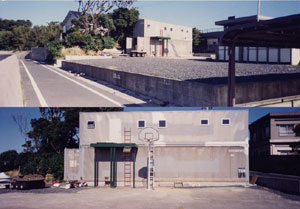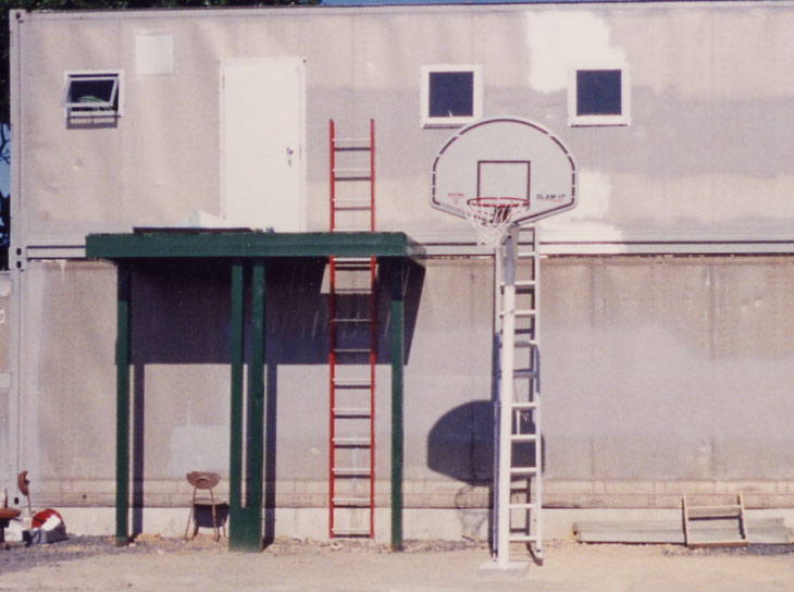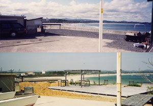 内装はボチボチやることにして、とりあえず2階部分のステップを自分で作ることにしました。 大工道具の関係から寸法だけ取っていって自宅の車庫で作ることになり、材木屋に行って「一番腐らない木は何だ?」と聞いたら「ヒバの木」だとのこと、さっそく取り寄せて、車庫での夜の作業が始まりました。 組み立ての作業はすべてボルトとナット絞めで強度と安全性には万全を尽くしました。 1週間ほどで組み上がったのだけれど、重くて人力では車庫から出せない。しかたなく一旦ばらして、レンタカー屋さんにいってユニック(クレーン)付のトラックを借りてきて運ぶことになりました。 そしてユニックで吊りながら現地で組み立てたものが写真のステップです。とにかく用心が悪いと考え、ラダー(赤いはしご)を使って上がり、潜水艦のハッチを開けるように蓋を開けステップの上に出る、蓋に鍵をかけるともう下からは上がれない、「ア〜アア〜俺は海のターザンだ!」の気分。 バスケットのゴールも自分一人で立てたのでセメントが固まるまでに風で傾いてしまった。 1993年、折しもバルセロナオリンピック大会のアメリカバスケットボールのドリームチーム(NBA)の影響で子供たちにバスケが大フィーバ。 近所の人の話では日曜日たくさんの子供が集まってここでバスケットボールの大草試合が始まるとのこと。 「こら〜ここはおれの家だぞ!」と怒鳴りたかったけれど、一度も子供たちとダブったことがない、恐るべきガキども・・・・・。 |