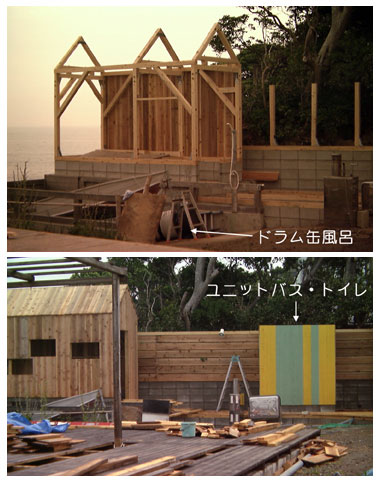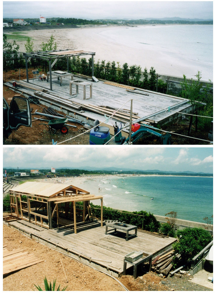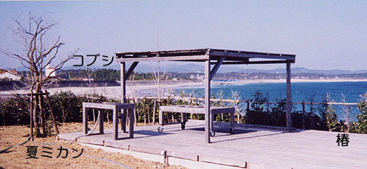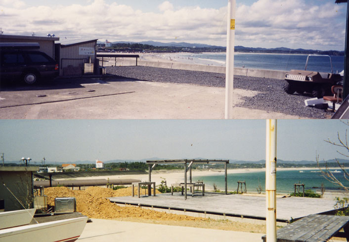 ![]() | 1993年、コンテナは建てたけどこのままではホゲーとしない、少し木でも植えてこの砂漠のような景色を変えたいと思うようになりました。 1994年に木を植えたのですが、1995年の写真で分かるように海沿いの木はほぼ全滅になってしまいました。海からの潮でやられてしまうのです。 この後1995年にも木を植えたのですが半分くらいが叉やられてしまいました。 植物図鑑で潮風に強い木を選んだのでしたが、机上の空論のようでした。 1995年せっかく海の家に来たなら外で食事がしたいということで、デッキをつくりました。近所の人が素見しに来て「先生、この上で踊りでもするんかいな」 その時にシャワー室を壊してしまったので暫く風呂のない生活になってしまった。 しかし、さすがに不便。ボイラーはあったのでドラム缶を買ってきてそれを風呂がわりにした。完全な露天風呂・・・・これがなかなか快適なんです。 最初の頃の海の家で一番思い出になったのは「ドラム缶風呂!」なんてその後何人かに言われました。 |